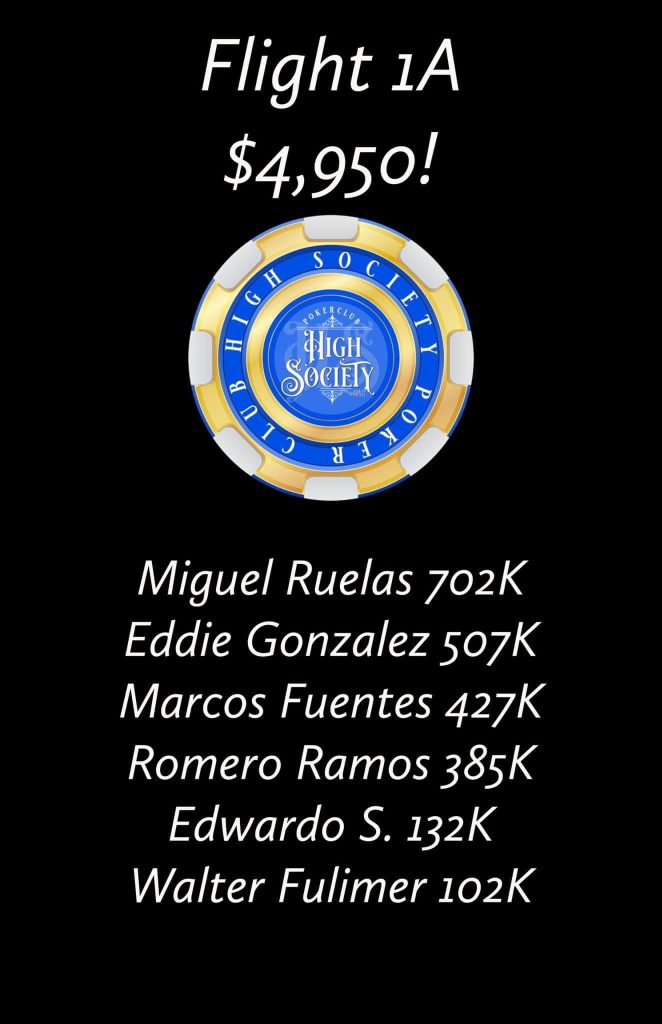 Even though I personally played terribly yesterday, I was still very impressed with the atmosphere of the tournament. There were a lot of positive comments from players all the way around. Even though Day 1b hasn’t even started yet, I have a strong feeling High Society will be setting the bar for poker tournaments here in El Paso. Day 1b starts today at 6pm. Day 1c and 1d will be held on Friday and Saturday. Finals on Sunday. Good luck players.